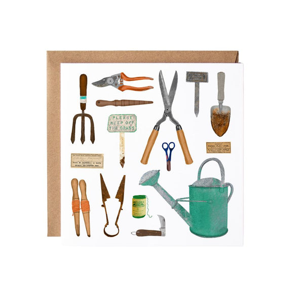 Transform your gardening experience with this stunning card featuring a charming 'Green Fingers' illustration of essential garden tools. The antique watering can, aged trowel, and vintage seed packets will captivate any green thumb and make the perfect gift for the passionate gardener in your life. Feel the joy and inspiration of a flourishing garden with this beautiful greeting card.