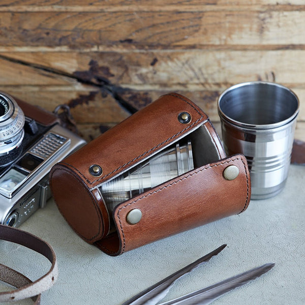 Experience the convenience and style of our leather case with four metal stirrup cups, secured with two stud fastenings.