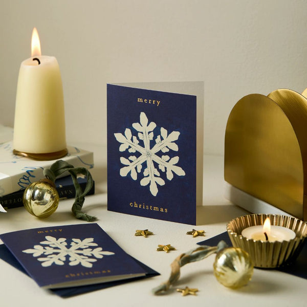 This charming snowflake card captivates with its elegant simplicity, featuring a rich indigo backdrop and matching envelope. The delicate snowflake motif is complemented by shimmering gold foil lettering, making it a perfect festive greeting. Each card comes with a coordinating deep blue C7 envelope for a complete, stylish presentation.