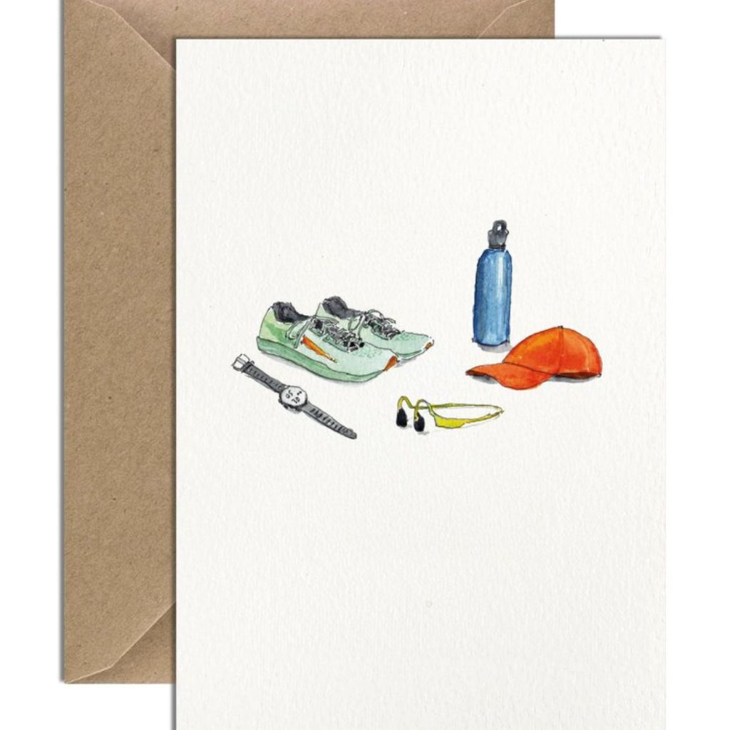 Add some motivation to your loved ones' active lifestyle with this beautifully hand-painted running-themed greetings card. It captures the perfect combination of running shoes, earphones, a water bottle, a cap, and a running watch in a vibrant watercolour design. Perfect for birthdays, race celebrations, or just as a simple gesture of encouragement.